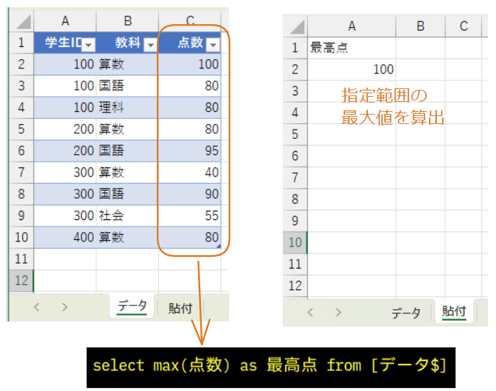 2023-05-06 SQLでExcelの集計を簡単・楽しく - MAX関数 SQL VBA SQLには集約関数という、列の指定した要素を集計するための関数が用意されています。 集約関数 MAX関数 MAX関数使用例 集約関数 関数 機能 COUNT 行数を数える SUM 数値の合計を算出 AVG 数値の平均を算出 MAX 数値の最大値を算出 MIN 数値の最小値を算出 MAX関数 今回は集約関数の中からMAX関数を紹介します。 MAX関数の構文は以下のとおりです。 select max(列名) from テーブル名 MAX関数使用例 次回は集約関数のAVG関数を紹介していきます。 www.excellovers.com