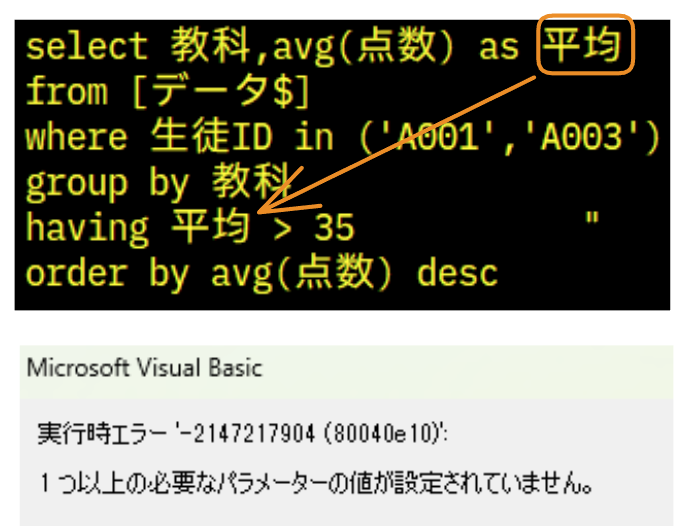 これはHaving句を実行する際にはSELECT文が実行されていないため、「平均」という別名を認識していないために発生します。
