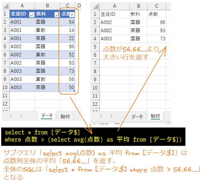 返ってきた平均値を外側のSQL文のWhere句の条件に組み合わせることで、全体の平均点より上の点数である3行が抽出されました。