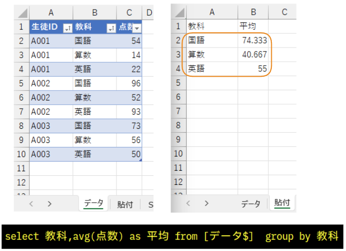 相関サブクエリに取り掛かる前に、まずはそれぞれの教科の平均点を確認しておきます。