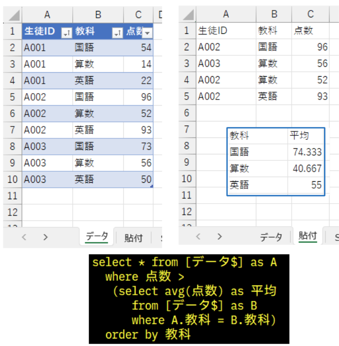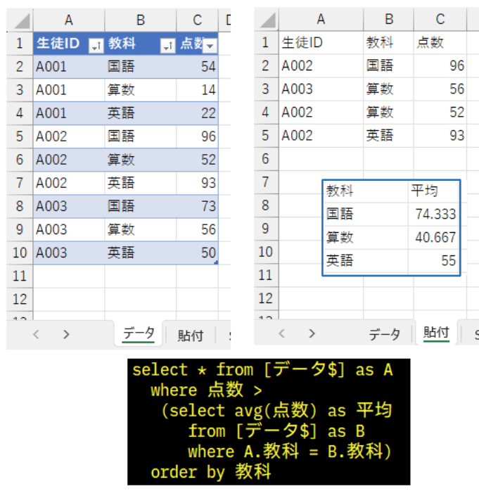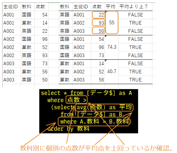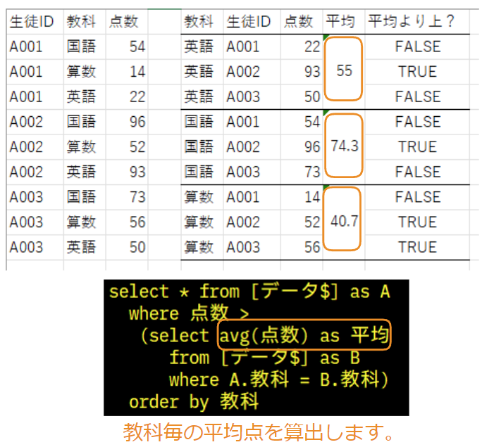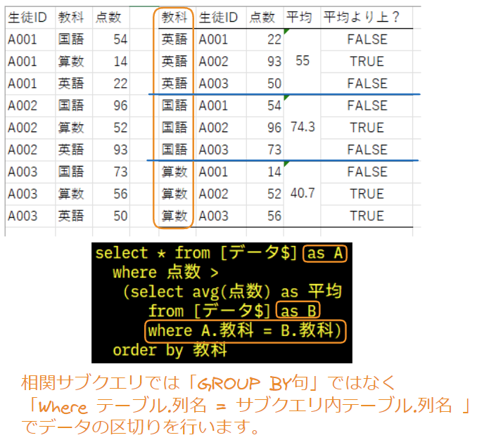 相関サブクエリを利用することでWhere句で単一の値ではない複数の値(教科ごとの平均)と比較することが出来ました。