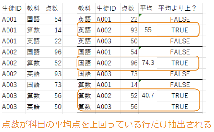 算数の2名は全体平均を下回っていますが、ちゃんと科目ごとの平均点との比較のためTRUEになっています。