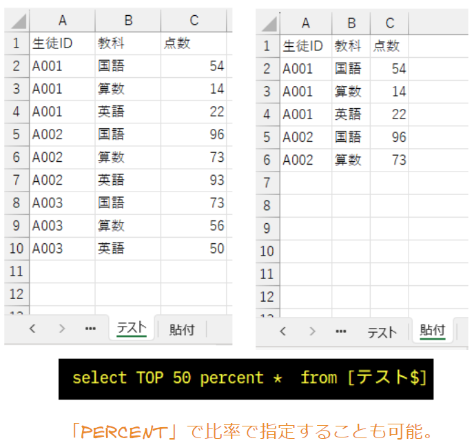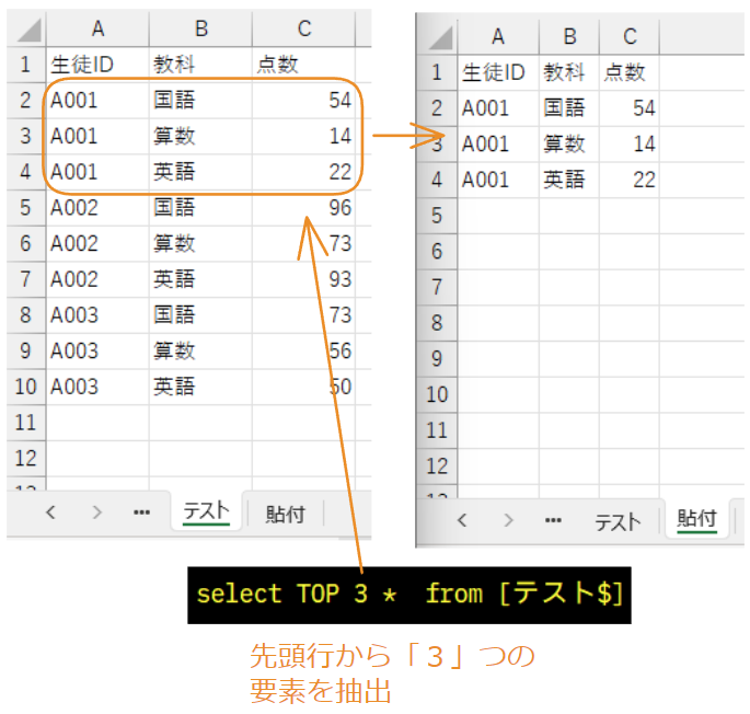 抽出されたデータの内、「数値」で指定した要素数のみを表示する、「TOP句」です。